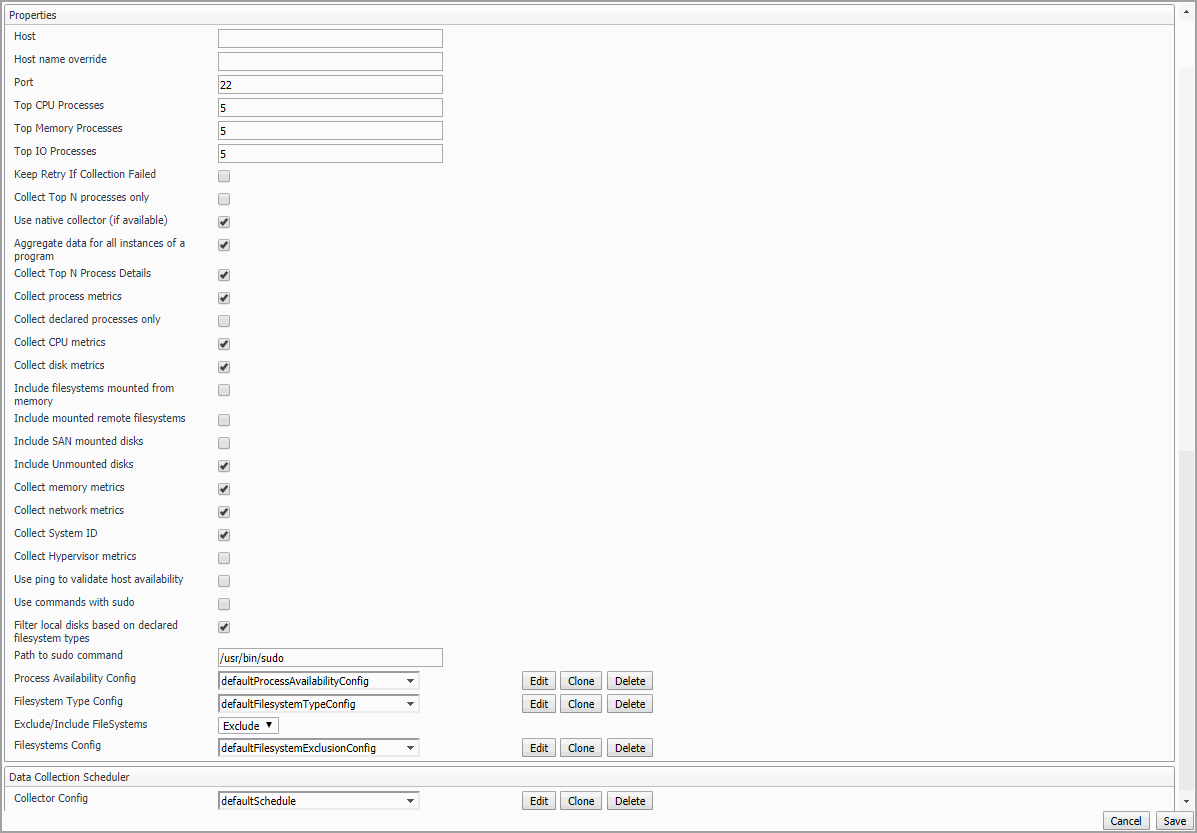 Collector Config: Defines how quickly the agent collects data. UNIX® provides a defaultSchedule configuration. Users can modify, clone, and delete configurations, as necessary.