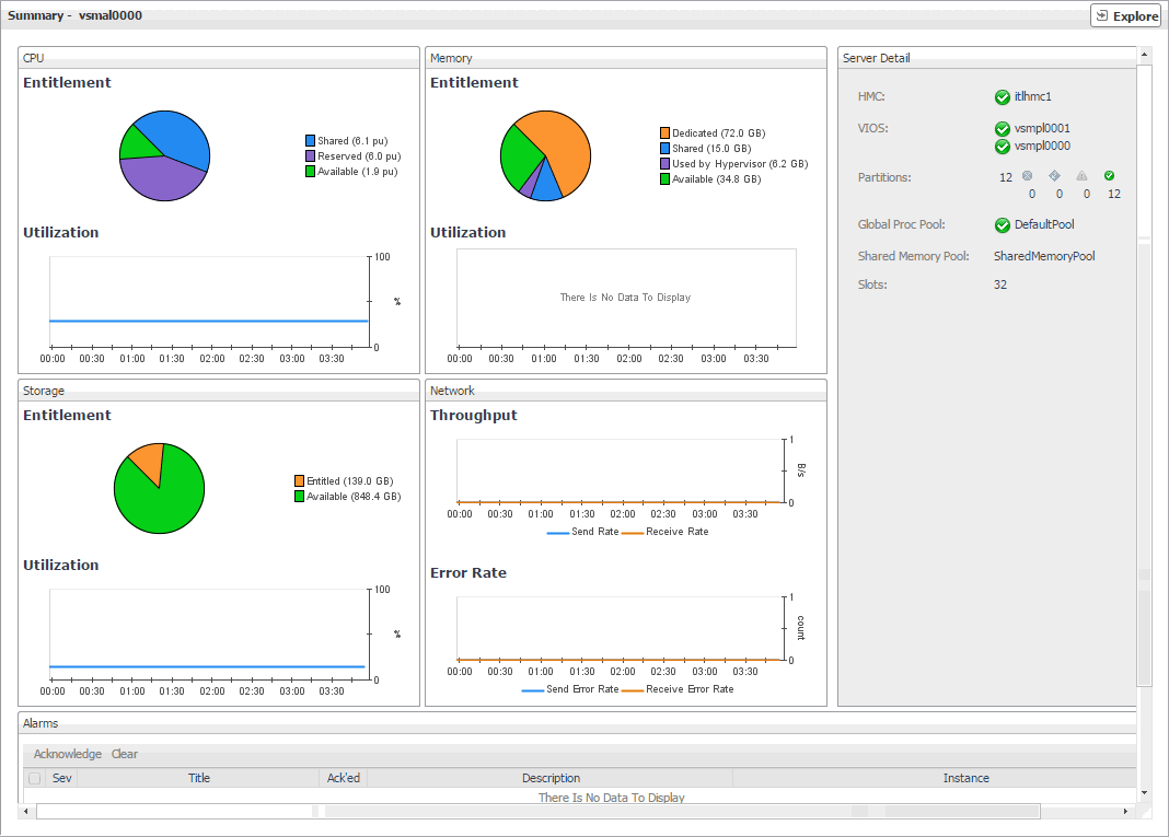 The managed server Summary view displays the resource utilization for the selected managed server. This view shows the levels of processor, memory, disk, and network usage. It also identifies the elements of your PowerVM infrastructure associated with the selected managed server, such as the HMC, VIOS, logical partitions, and others.