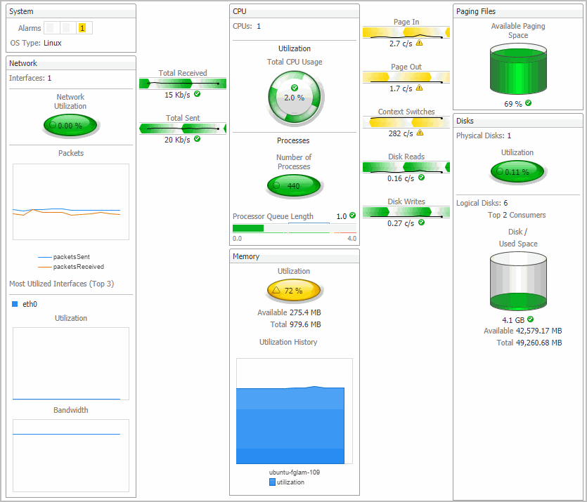 When you select a monitored host and display its resource utilization views in the Quick View, you can drill down to a detailed view to explore that host’s activity. For example, selecting a Windows® host and choosing Explore displays a monitoring dashboard that helps you understand the state of the host’s resources and how they affect your monitored system as a whole. Along with displaying the system, network, CPU, memory, disk usage metrics, and any related alarms, this intuitive dashboard connects these visual elements with a series of graphical flows that illustrate how quickly the hosts transmits and processes data in real time. For example, you can review the rates of incoming and outgoing data and how they affect your network resources.