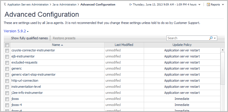Select the version of the Java EE agent that you want to manage from the Version list (for example, 5.9.2 or 5.8). |
