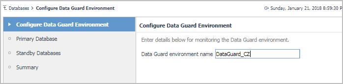 IMPORTANT: Before configuring a new complete Data Guard environment via the Data Guard tab, you should add to monitoring its Primary database and Standby database using the Oracle Instances > Monitor dashboard; otherwise you will not be able to add these databases to the configured Data Guard environment. Creating a new Data Guard environment via the Data Guard tab is an optional feature which provides detailed visibility into your data guard environments performance and stability. For more information about how to add the Primary database and Standby database, refer to Installing and Monitoring a Single Oracle Instance . |