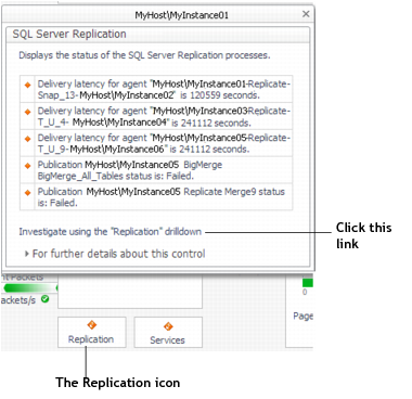 Click the link Investigate using the Replication drilldown in the SQL Server Replication pop-up, which appears when you click the Replication icon under the Background Processes section of the instance's home page.