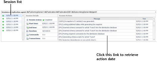 Publisher to Distributor — displays the session actions of the Snapshot or Log Reader agent.