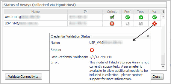 Each row in this panel displays whether the array is configured for collection, and the status of the last collection attempt to that array. Clicking on the status icon displays the popup that provides error information, if the status was not successful.