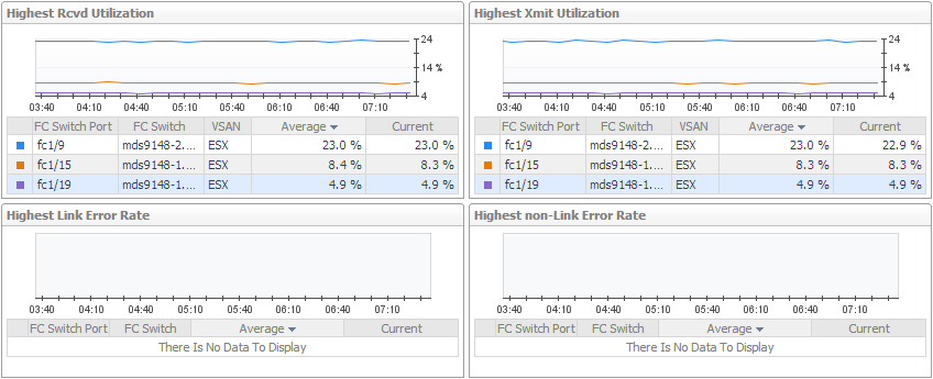 Highest charts. The charts display the top three N ports in the fabric with the highest average Rcvd Utilization, Xmit Utilization, Link Error Rate, and Non-Link Error Rate, respectively. The tables show the average and current values for the ports.