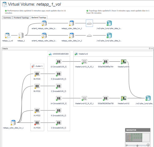 In the Backend Topology tab, displays the dependency mapping from the virtual volume to the destination LUNs. Click a cloud node to display the network dependency mapping from the virtual volume to the destination LUNs.