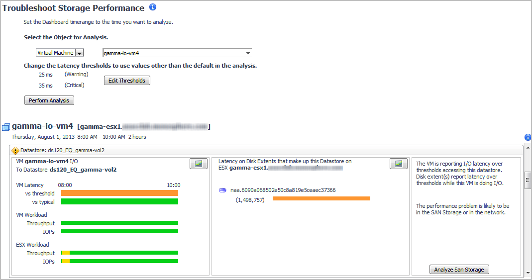 Administrators may receive problem reports from stakeholders about the performance of a VMware virtual machine (VM). When the suspected cause is storage, the Administrator can run an automated analysis using the Storage Troubleshooting dashboard. The analysis can quickly rule out a storage issue, allowing the Administrator to focus on other areas. Conversely, if a storage issue is found to be contributing to poor performance, the results of the analysis clearly highlights the datastores or RDM disk extents that require attention.