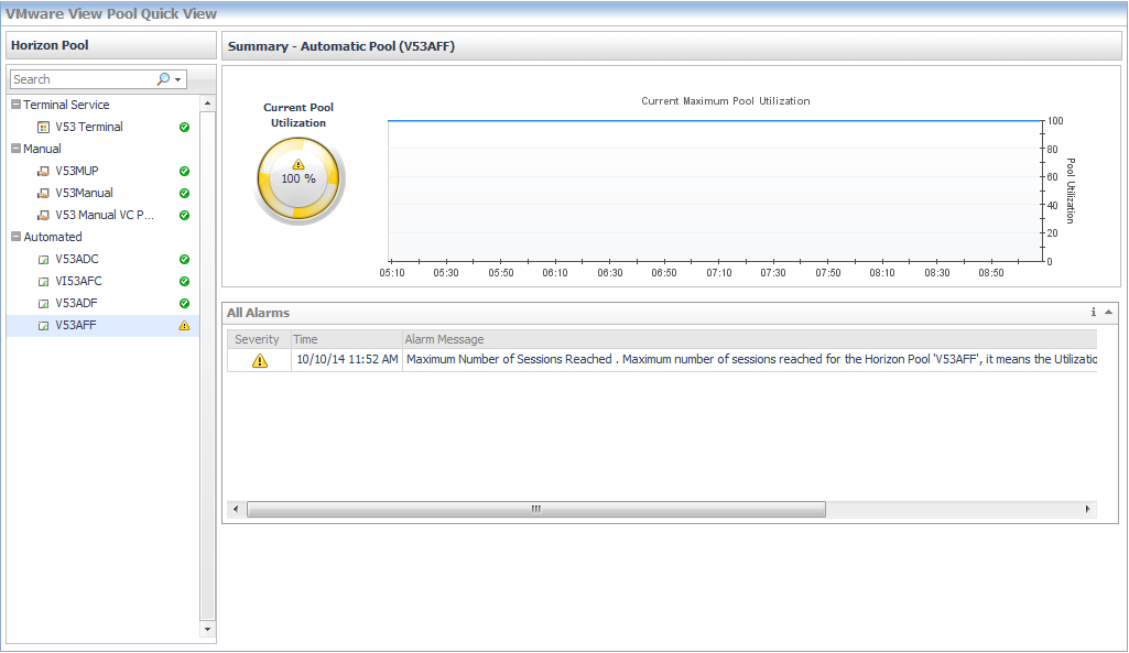 When you click the Desktops tile, a list of Virtual Machines, Terminal Service Hosts, and Unmanaged Desktops on Physical Hosts is displayed in the Quick View.