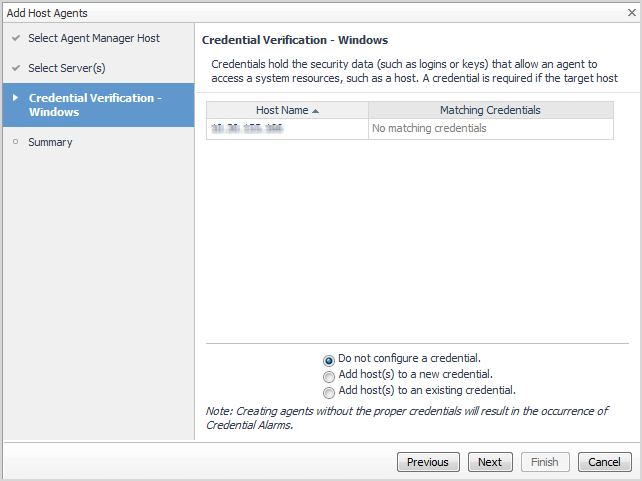 The Credential Verification - Windows page appears. Credentials are security data that provide the Infrastructure agents with the permission to monitor system resources, such as a host or a range of hosts.