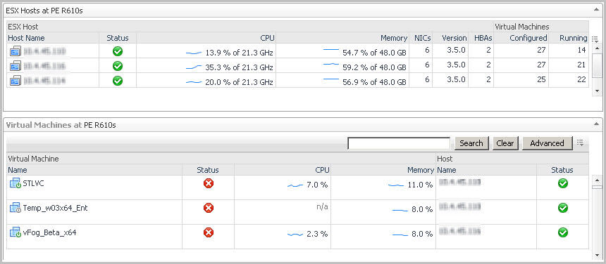 If, however, you select a collection of ESX Hosts from the Virtual Infrastructure view and you open the Summary tab, an informative graph appears in place of a Utilizations view. Selecting a collection of objects in the Virtual Infrastructure view always shows a composite view displaying information about all object instances contained in that collection.