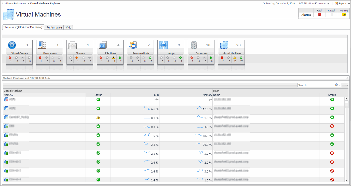 The Virtual Infrastructure view provides an organized view of the various virtual infrastructure objects that are monitored by Foglight for VMware. It serves as a navigation tool, and it also presents pertinent alarm information.