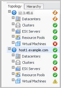 Within the Topology view, all of the virtual infrastructure objects are organized into a tree using object type (or topology type) containers for branches. The top-level objects in the Topology view are always the vCenters.