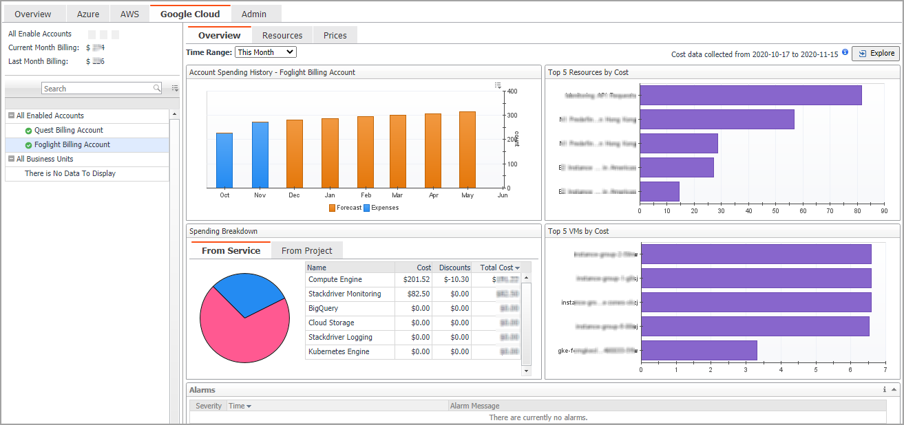 All Enabled Billing Accounts Spending History/Top 5 Billing Accounts by cost/Spending Breakdown: These three views will display the relevant cost information if you select All Enabled Billing Accounts or All Business Units from the object tree view. |