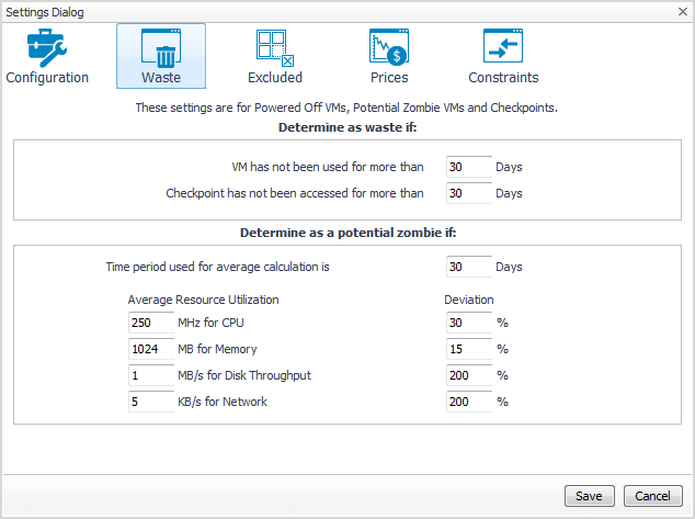 VM has not been used for more than [x] Days. Defines when a powered-off VM is wasting resources in your environment by not being used. |