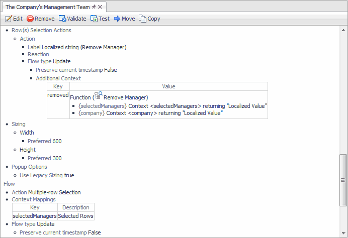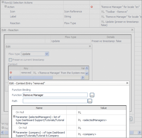 Notice that the Action is Add Manager, accessed by choosing Invoke Function. A key (addManager) must be supplied, but in this tutorial it is not used anywhere but in the Flow type editor.