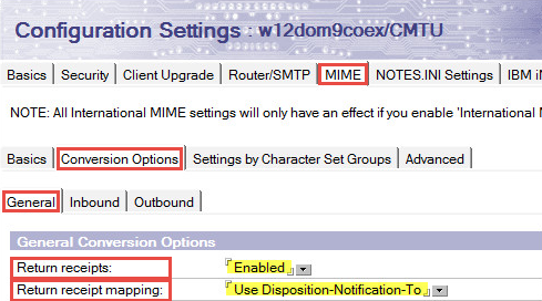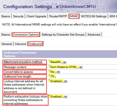 1. Finally, on the MIME tab, select the Conversion Options tab and then the Outbound tab. Next, navigate to the Outbound Conversions Options section and edit the Server Configuration document to match the Recommended Values in the table below.