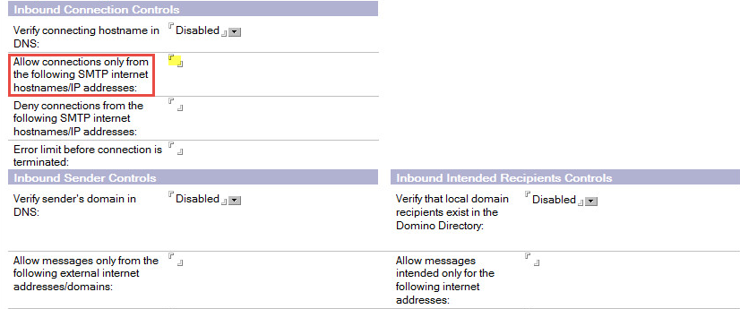 1. While on the Router/SMTP tab, click the Restrictions and Controls… tab and the SMTP Inbound Controls tab. Edit the Server Configuration Document to match the Recommended Values in the table below. Each of the three fields shown below should be populated with the IP address of either the Exchange Hub Transport server or array.