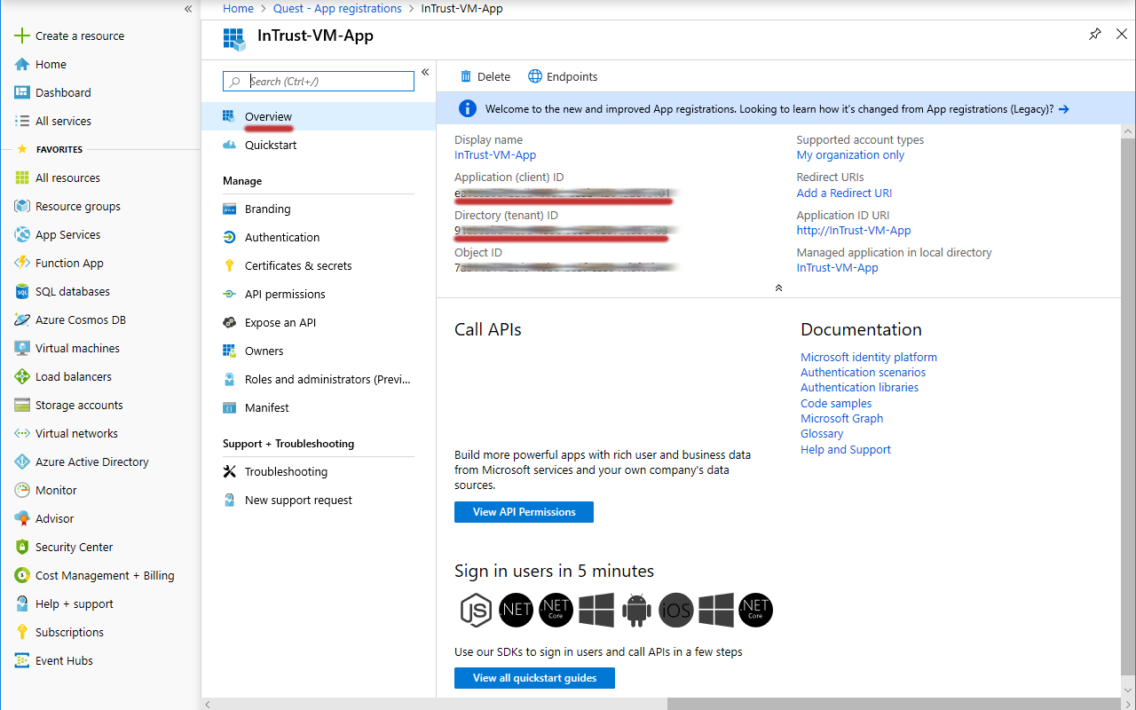 5. On the Overview screen for the application you specified, copy the values of the Directory (tenant) ID and Application (client) ID settings and save them for later use.