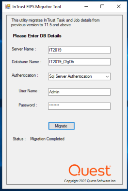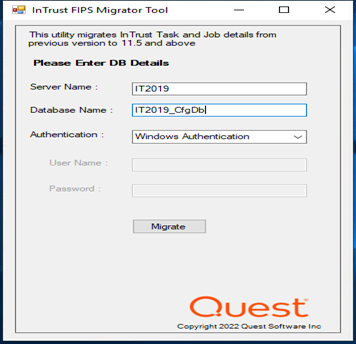 3. Launch InTrustFIPSMigratorTool.exe tool with local admin privilege and the SQL login having SQL admin privilege.