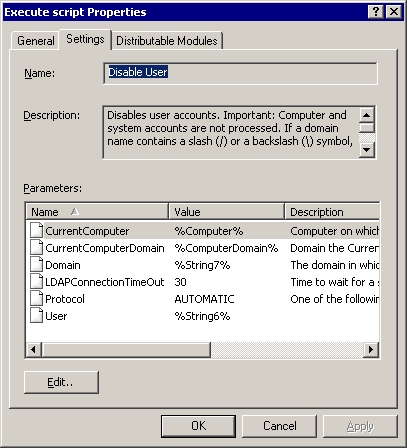4. On the Settings tab, use the Edit button to specify what values (fixed or dynamic) the rule passes to the script.