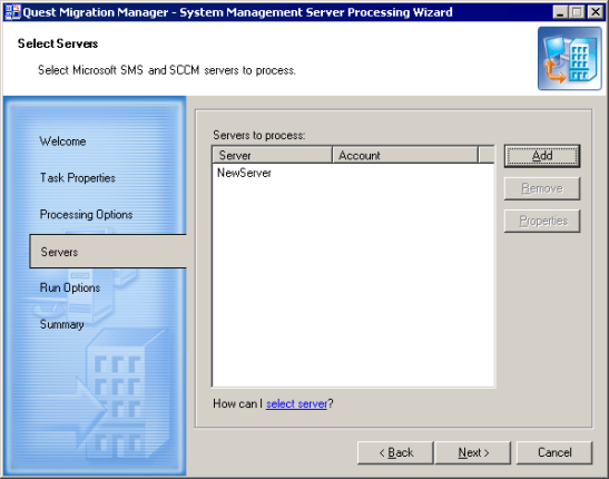 Use the Add button to add SMS servers to be processed by this task. In the Add SMS Server dialog box that appears, either type the server name in the text box or use the Browse button to select the server from the list.