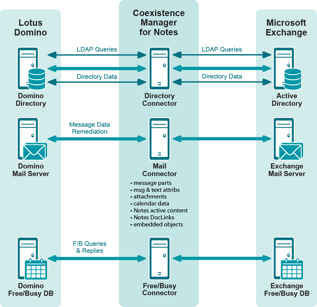 Coexistence Manager for Notes (CMN) is a separate Quest product designed to provide rich directory, email and calendar coexistence features between Notes and Microsoft Exchange (including Office 365). To accommodate the three primary issues of a Notes–Exchange coexistence, CMN provides these three primary components: