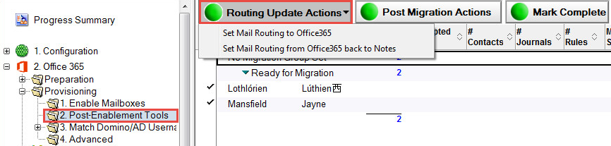 1. Expand the Provisioning | Post-Enablement Tools view to update routing to the Exchange account and other post migration actions