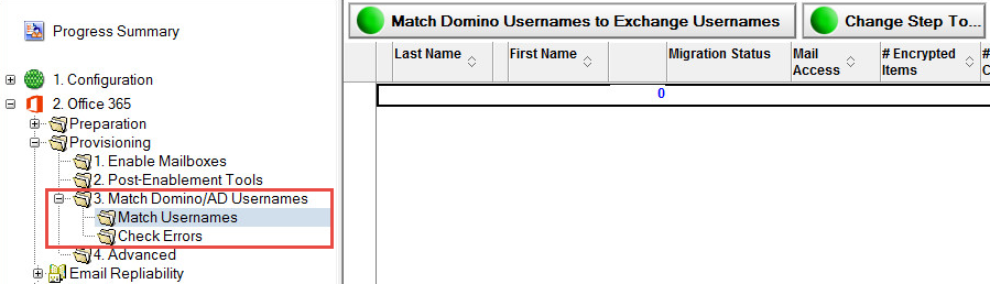 Before end user mail file migration takes place, be sure that the Notes users have matching accounts in Office 365 (in Validation). This process helps in checking if the username that is being migrated has an existing account in the new Office 365 environment. However, matching usernames is not required if you are migrating to a .pst file.