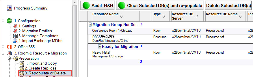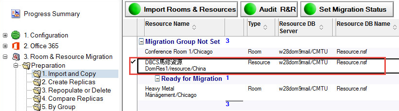 2. Click Yes to confirm setting the migration group. Notice that the selected rooms and resources are now listed under the newly created group: