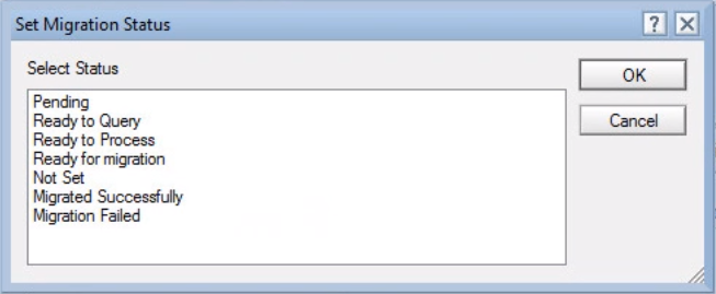 1. From the Set Migration Status drop-down menu, select the Set Migration Status menu option; a dialog box appears with a list of status codes you specified in the Required Settings tab