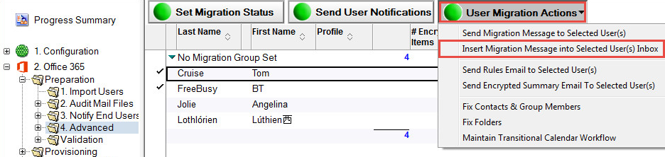 The Advanced view provides some additional tools, such as setting migration status, sending, or inserting migration messages, which prepare and manage your data for migration.