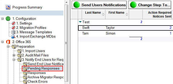 To demonstrate this, if user John Smith has not performed the required action, the Data Pane will show that two notifications have been sent, one requires user action, and no response has been received. In a situation like this, you may want to send another notification prompting users to respond to migration notifications. |