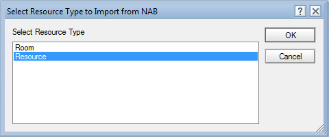 The Select Resource Type to Import from NAB dialog box appears; Room is selected by default; click OK: