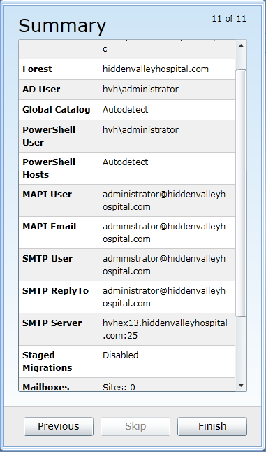 The Summary screen shows the settings and choices you have entered to configure your tenant target forest.  Review the settings to make sure they are correct for the designated tenant forest.  (If you want to change anything you can click Previous to return to an earlier screen.)