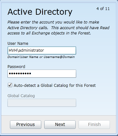 You can either automatically select a global catalog by selecting the Auto-Detect a Global Catalog for this Forest checkbox, or manually specify one in the Global Catalog field.