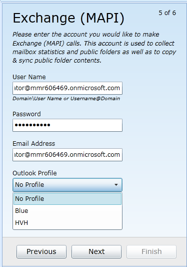 In this Exchange (MAPI) screen: Enter the User Name, Password and Email Address, and specify the Outlook Profile of the account to use for Exchange (MAPI) calls.