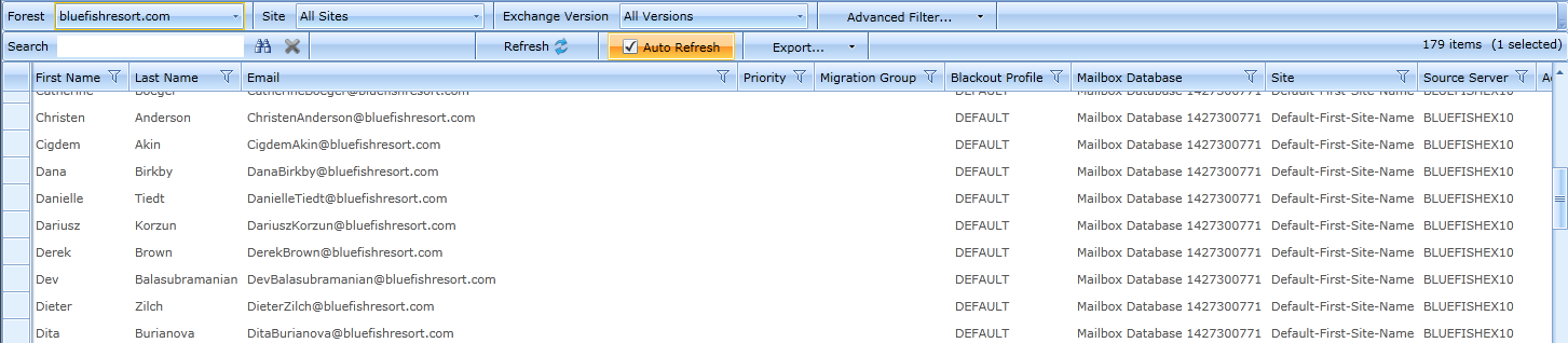 • Mailboxes: Lists mailboxes from all the sites in the specified forest. In addition, it allows you to sort, group, search, and select mailboxes to add to the migration queue.