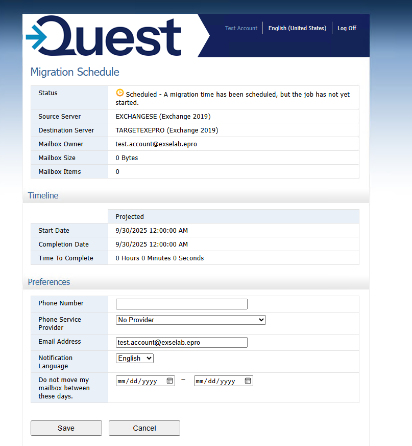 The purpose of this portal is to allow end users to participate in a migration project. Prior to migration, the user can set an external email address to receive notifications, an SMS mobile number, blackout dates, and notification options.