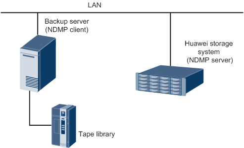 Environment configured to support a three-way network — remote — topology: Data that you want to back up in the file system is written to the tape library through the connection between storage devices A and B. When you want to recover data, storage device A reads data from the tape library and writes the data to the file system through the connection between storage devices A and B. For more information, see the following figure.