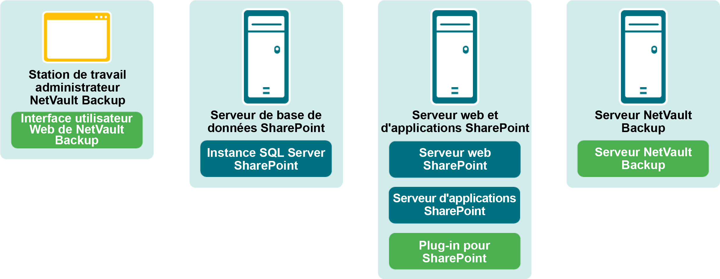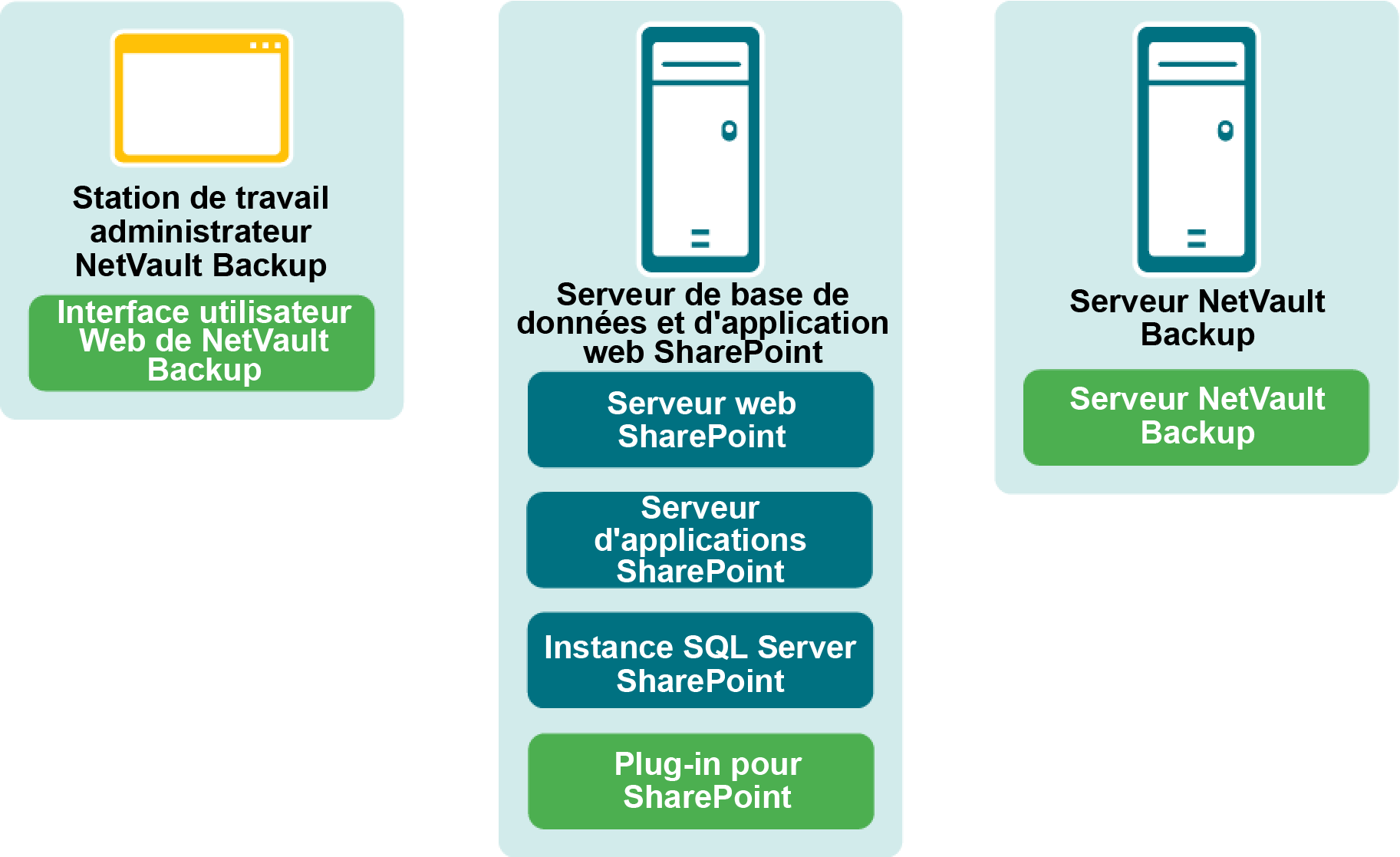 Dans un déploiement de petite batterie de serveurs, l'instance SQL Server SharePoint réside sur un serveur dédié alors que le serveur d'applications et le serveur web se trouvent ensemble sur un serveur distinct. Le plug-in est installé sur le serveur où le serveur d'applications et le serveur web se trouvent et effectue toutes les sauvegardes et restaurations à partir de ce serveur.