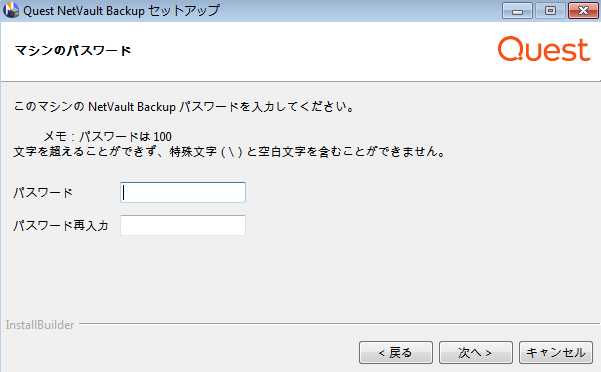 マシンのパスワードは、NetVault Backupクライアントをサーバーに追加する際に使用します。パスワードには、最大100文字を使用することができます。以下の文字を使用することはできません。