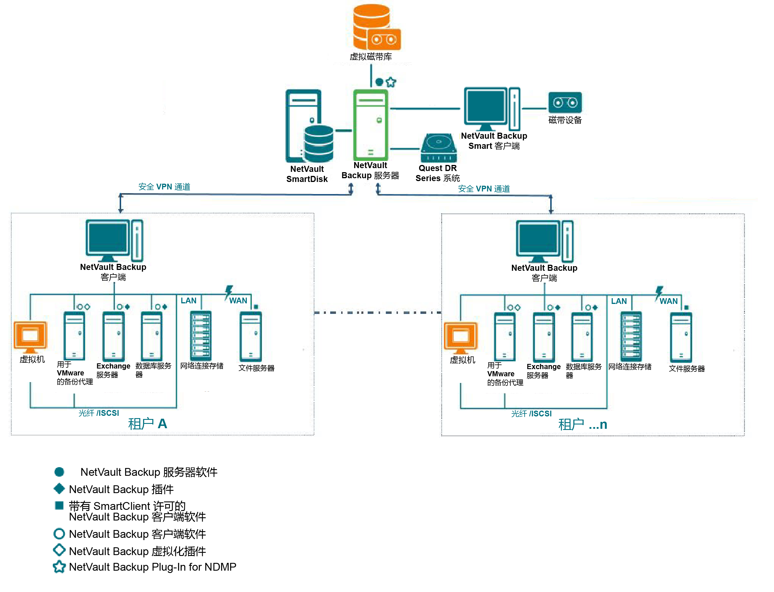 NetVault Backup 客户端应分配到管理客户端所有数据保护操作的 NetVault Backup 服务器。一台服务器及其关联客户端便构成 NetVault Backup 域。在 MSP 环境中,租户 NetVault Backup 客户端通过安全通道 (VPN) 与 NetVault Backup 服务器和设备进行通信。