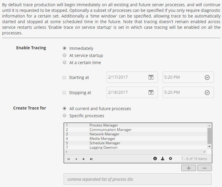중요: 여러 클라이언트를 선택하면 추적 활성화 옵션 대화 상자에 프로세스 이름 목록이 표시되지 않습니다. 모든 현재 및 미래 프로세스 옵션을 사용하거나 관련된 상자에 프로세스 ID 목록을 제공할 수 있습니다.