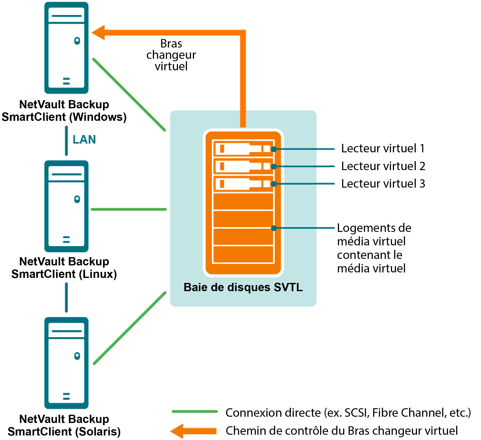 Les bibliothèques de bandes virtuelles partagées NetVault Backup étendent l'implémentation des VTL en permettant de partager une VTL avec plusieurs ordinateurs NetVault Backup pour des sauvegardes sans LAN.