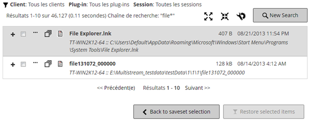 Pour rechercher des éléments de données dans un ou plusieurs ensembles de sauvegardes, sélectionnez le ou les ensembles de sauvegardes de votre choix et cliquez sur Rechercher. Si vous ne sélectionnez aucun ensemble de sauvegardes, tous les ensembles de sauvegardes seront inclus dans la recherche. La page Résultats de la recherche indique les fichiers ou les éléments de données spécifiés. La page des résultats de la recherche s'affiche lorsque la recherche dans le catalogue est configurée et activée sur votre système NetVault Backup.
