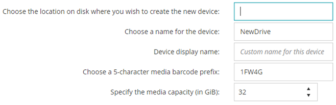 输入或选择虚拟磁带的大小。介质大小是以 GiB 为单位指定的。确保磁盘上的可用空间足以创建虚拟介质。默认值为 32GiB。