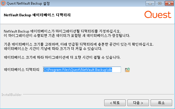 NetVault Backup의 기본 데이터베이스 디렉터리 경로는 기존 데이터베이스 경로와 같습니다.
