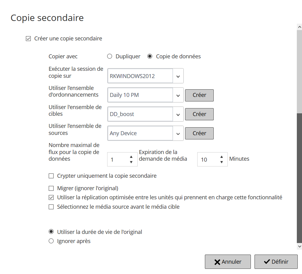 REMARQUE : l'expiration de la demande de média pour la phase 1 des sessions de copie de données (créées à l'aide du Plug-in for Data Copy) est contrôlée par le paramètre Expiration de la demande de média de l'ensemble d'options de sauvegarde. Elle n'est pas contrôlée par le paramètre Expiration de la demande de média de l'ensemble de cibles. L'expiration de la demande de média pour la phase 2 (copie secondaire) des sessions Copie de données et Dupliquer est contrôlée par le paramètre Expiration de la demande de média spécifié dans l'ensemble d'options de sauvegarde avancées.