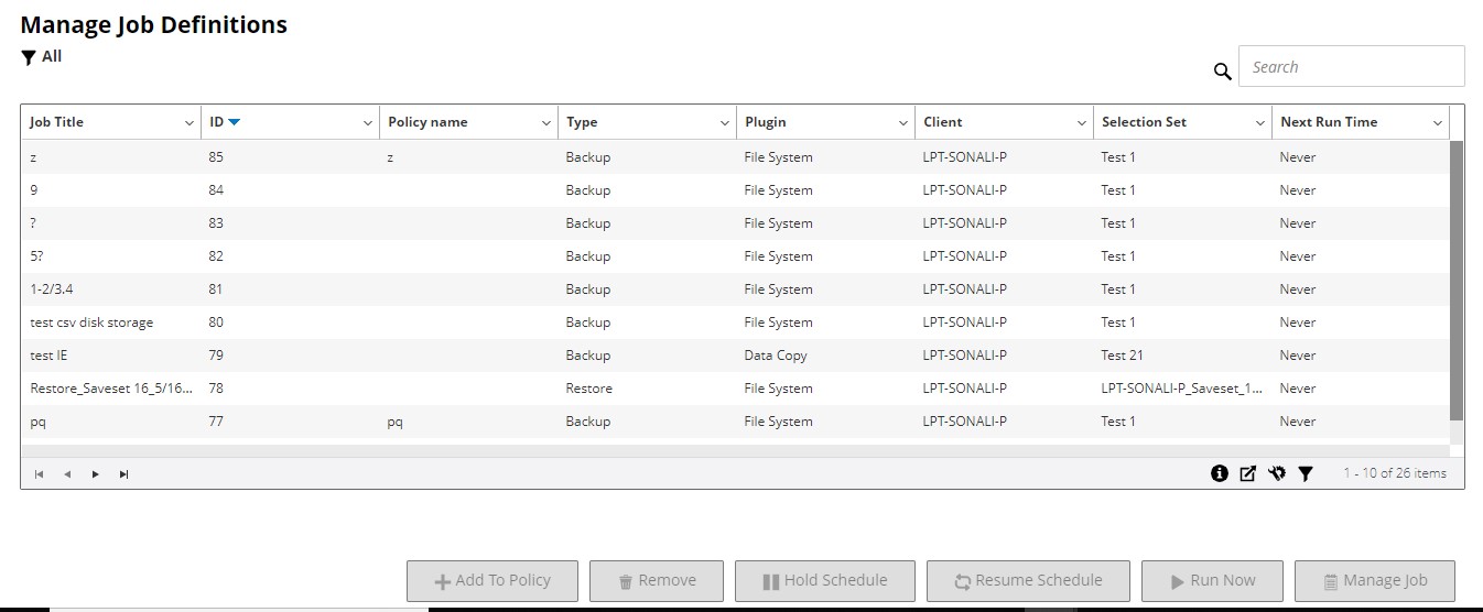 管理任务定义页面上,您可以查看 NetVault Backup 数据库中可用的任务定义。页面包括所有已计划和已保存任务。
