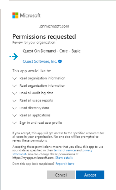 Quest is a Microsoft Verified Publisher and, as an additional security measure during the Admin Grant process, the customer can verify that the grant request is indeed initiated by Quest.